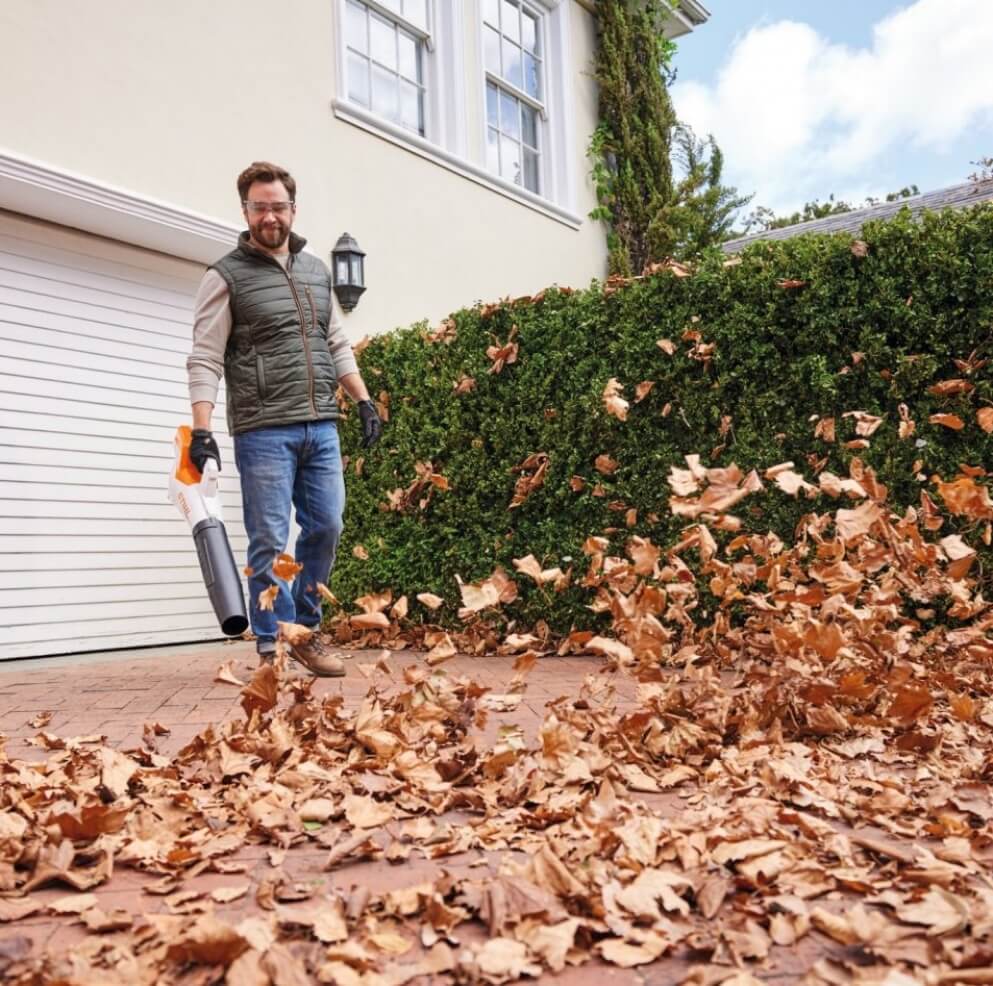 Clearing leaves and debris from patios and driveways
